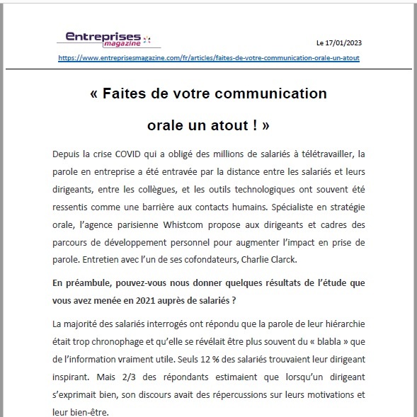 Spécialiste en stratégie orale, l’agence parisienne Whistcom propose aux dirigeants et cadres des parcours de développement personnel pour augmenter l’impact en prise de parole.